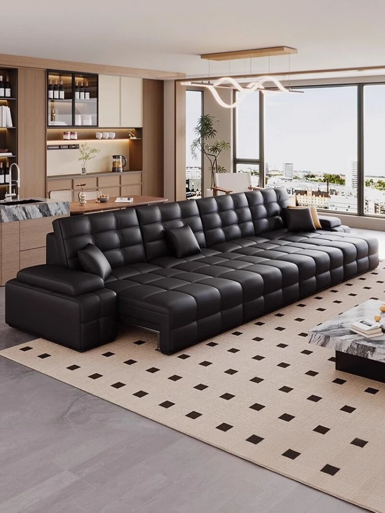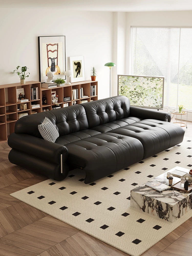 Electric Multifunctional Genuine Leather Sofa Bed - Retro Italian Design, Convertible for Living Room Use, First-Class Expandable Black Sugar Cloud Sofa