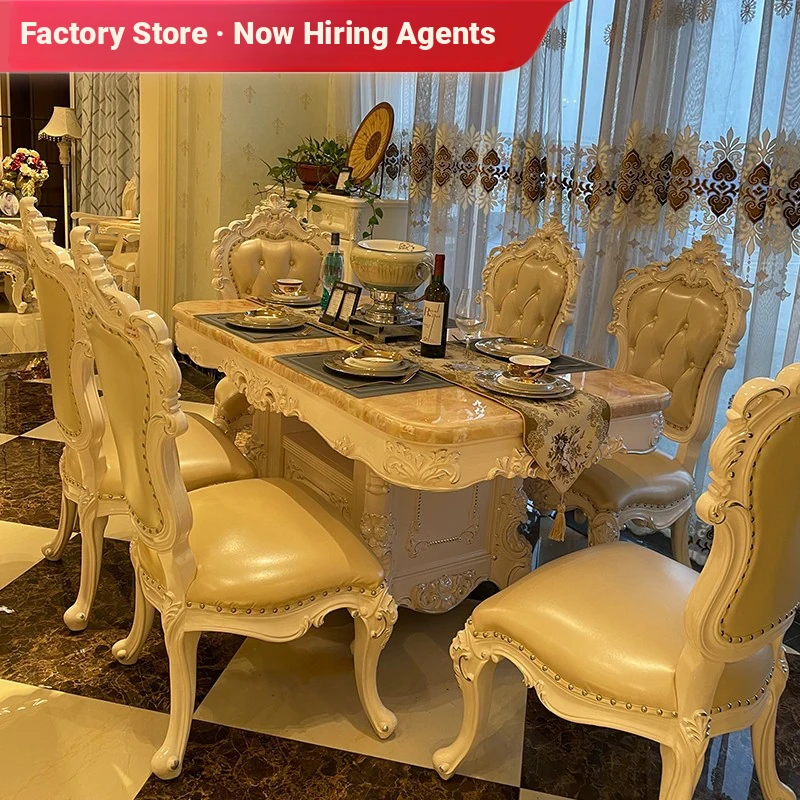 Luxury European Style Rectangular Marble Dining Table with Storage - Solid Wood Carved Natural Dining Set for 4/6 Chairs