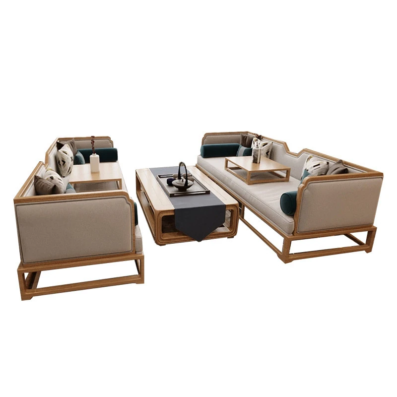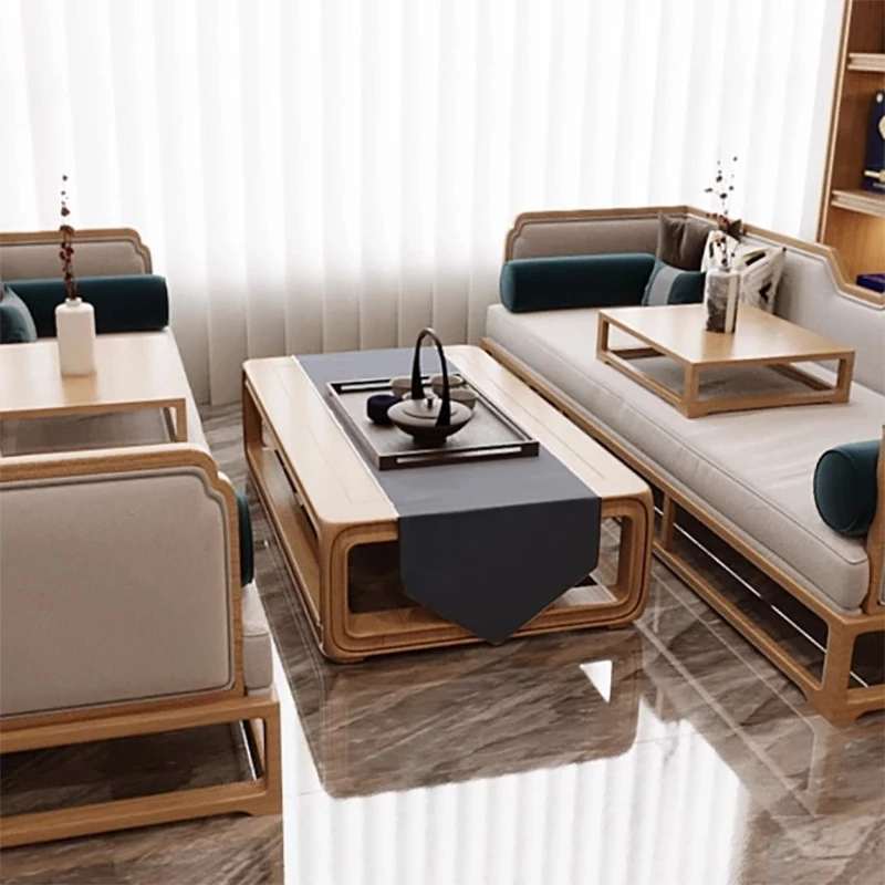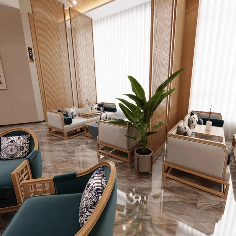 Elegant New Chinese Style Solid Wood Sofa Set for Tea House – Ideal for Hotels, Guesthouses, and Club Lobbies. Perfect for Reception Areas and Meeting Spaces. Cozy and Stylish Booth Furniture for Your Business Needs.