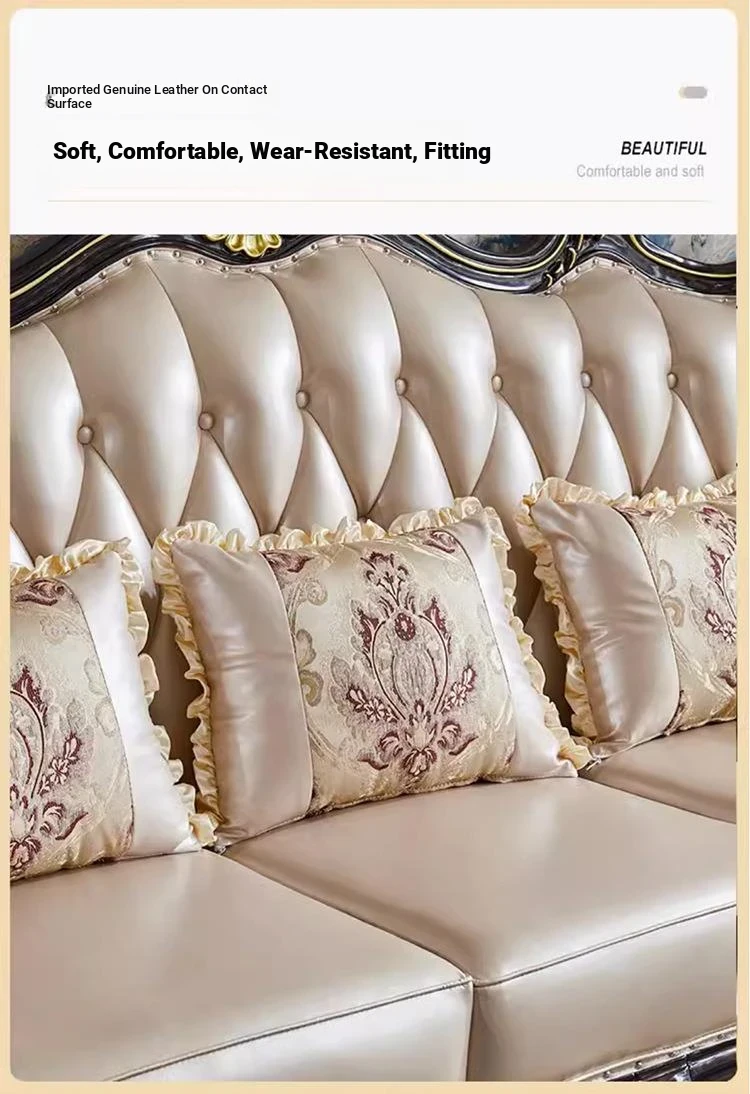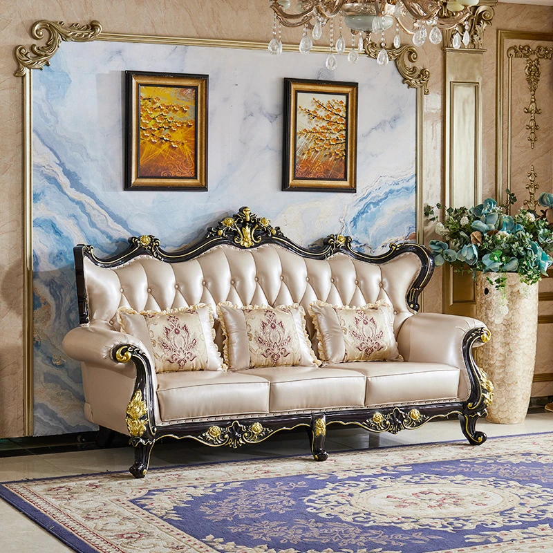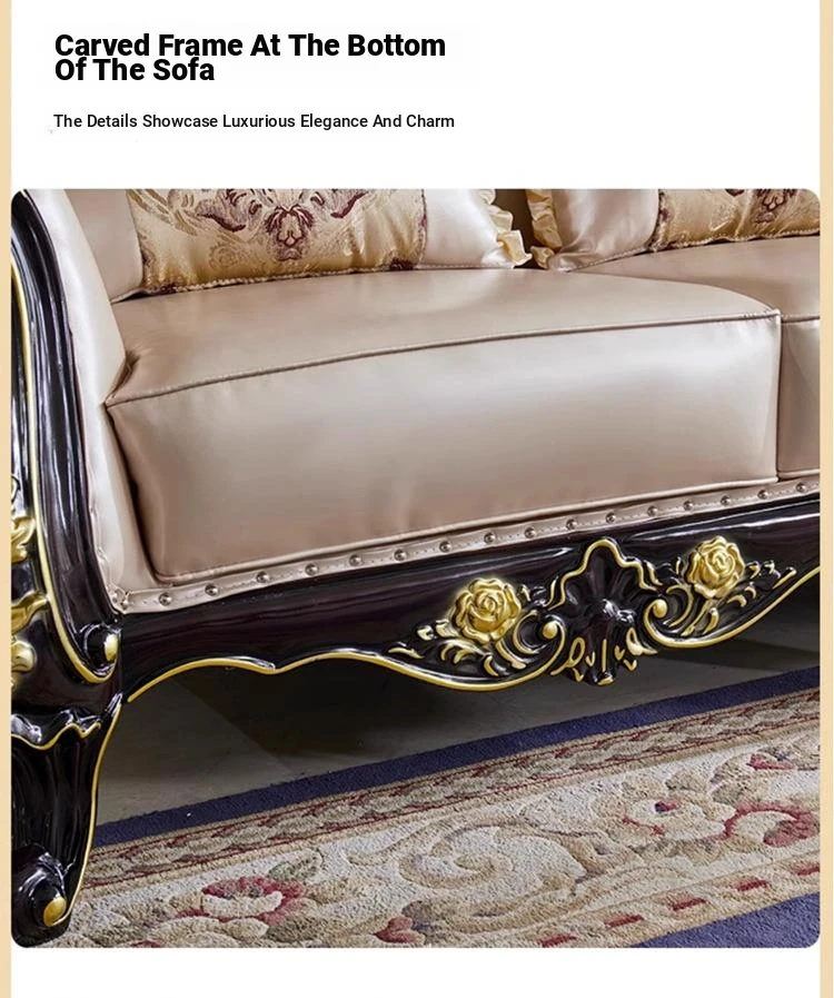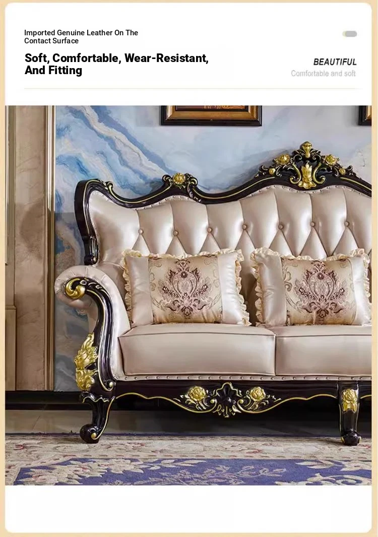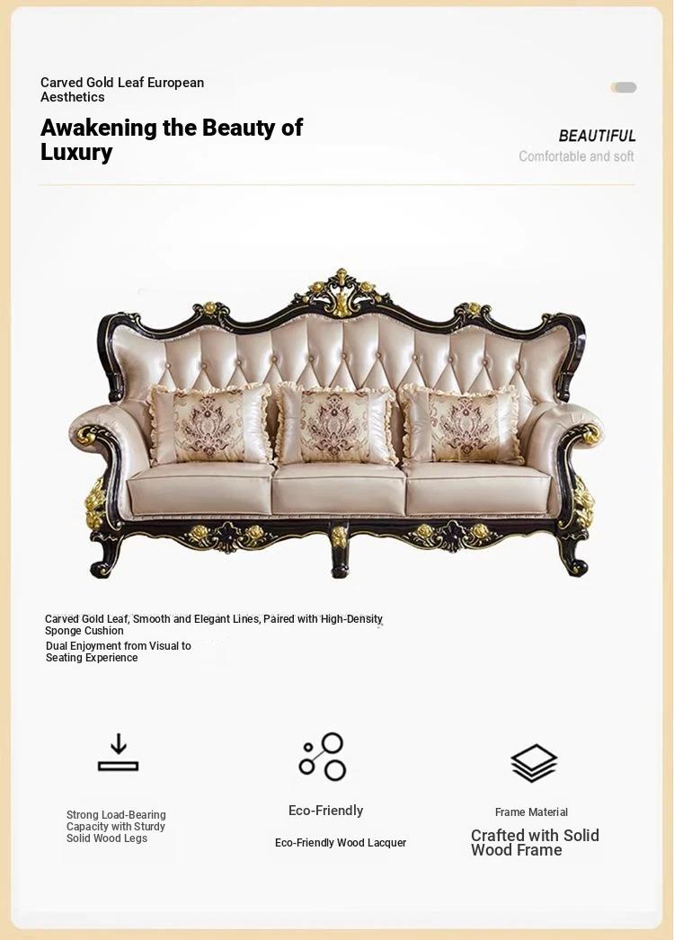 Luxurious European Leather Sofa Set for Villa - Exquisite Solid Wood Carved Dark Ebony Three-Seater Sofa for Elegant Living Rooms