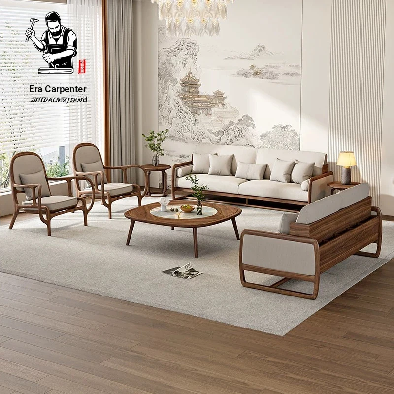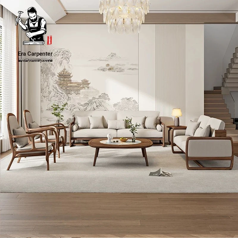 Modern New Chinese Style Black Walnut Wood Sofa Set - Spacious 3-Seater Upholstered Living Room Furniture with Storage for Large Homes