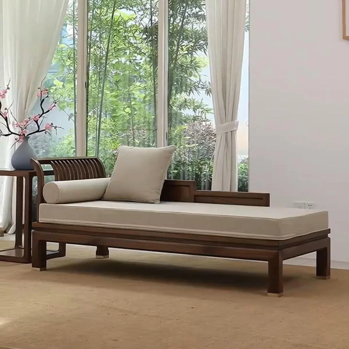 New Chinese Zen Style Chaise Lounge Sofa Bed in North American Black Walnut and Ash Wood - Perfect for Offices, Hotels, and Guesthouses, Elevate Your Living Room Aesthetic with This Elegant Furniture Piece.
