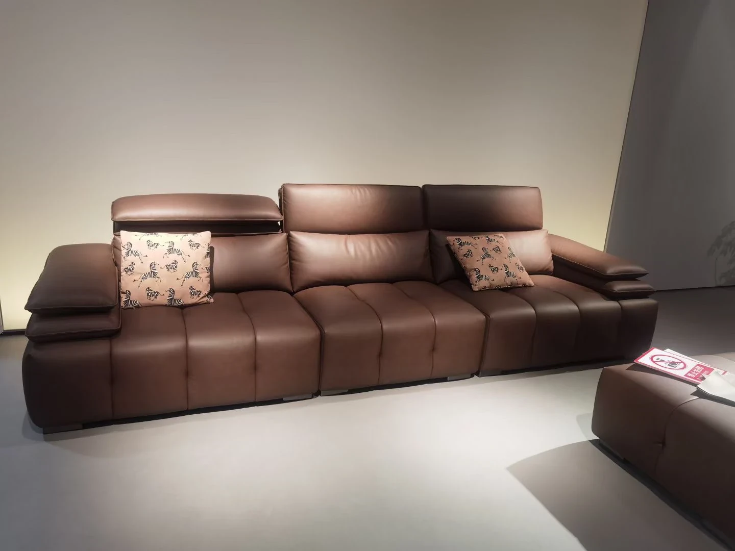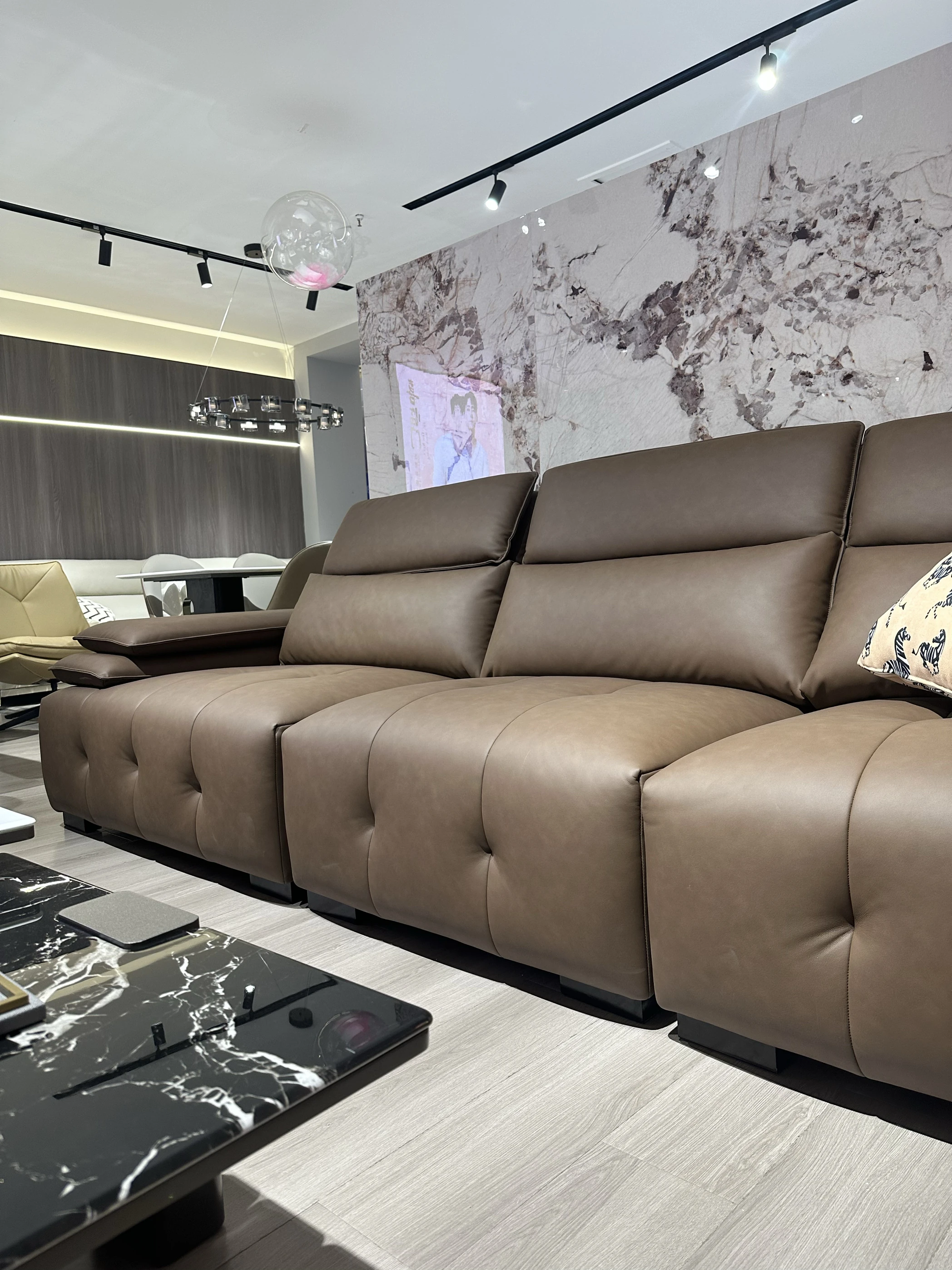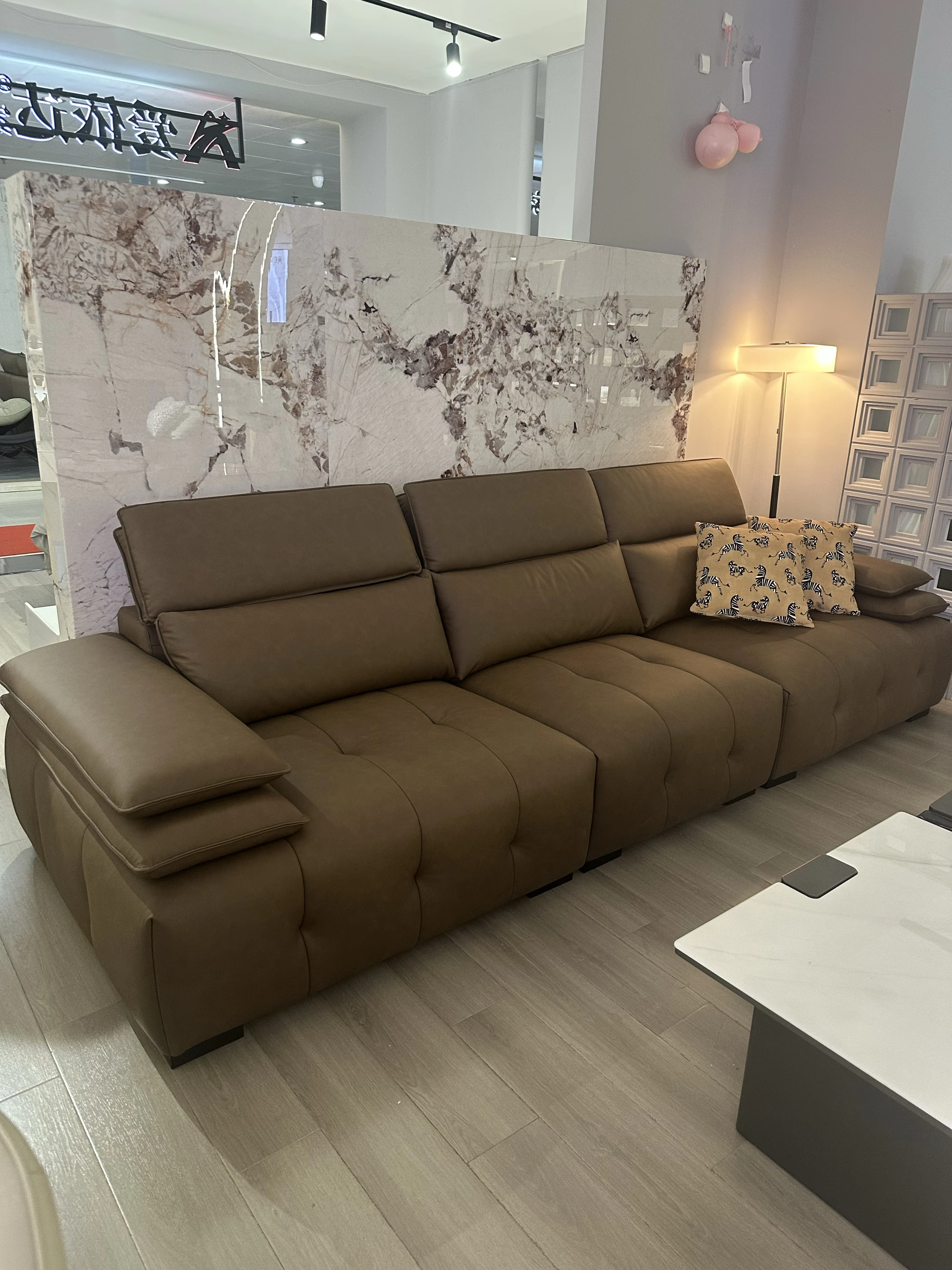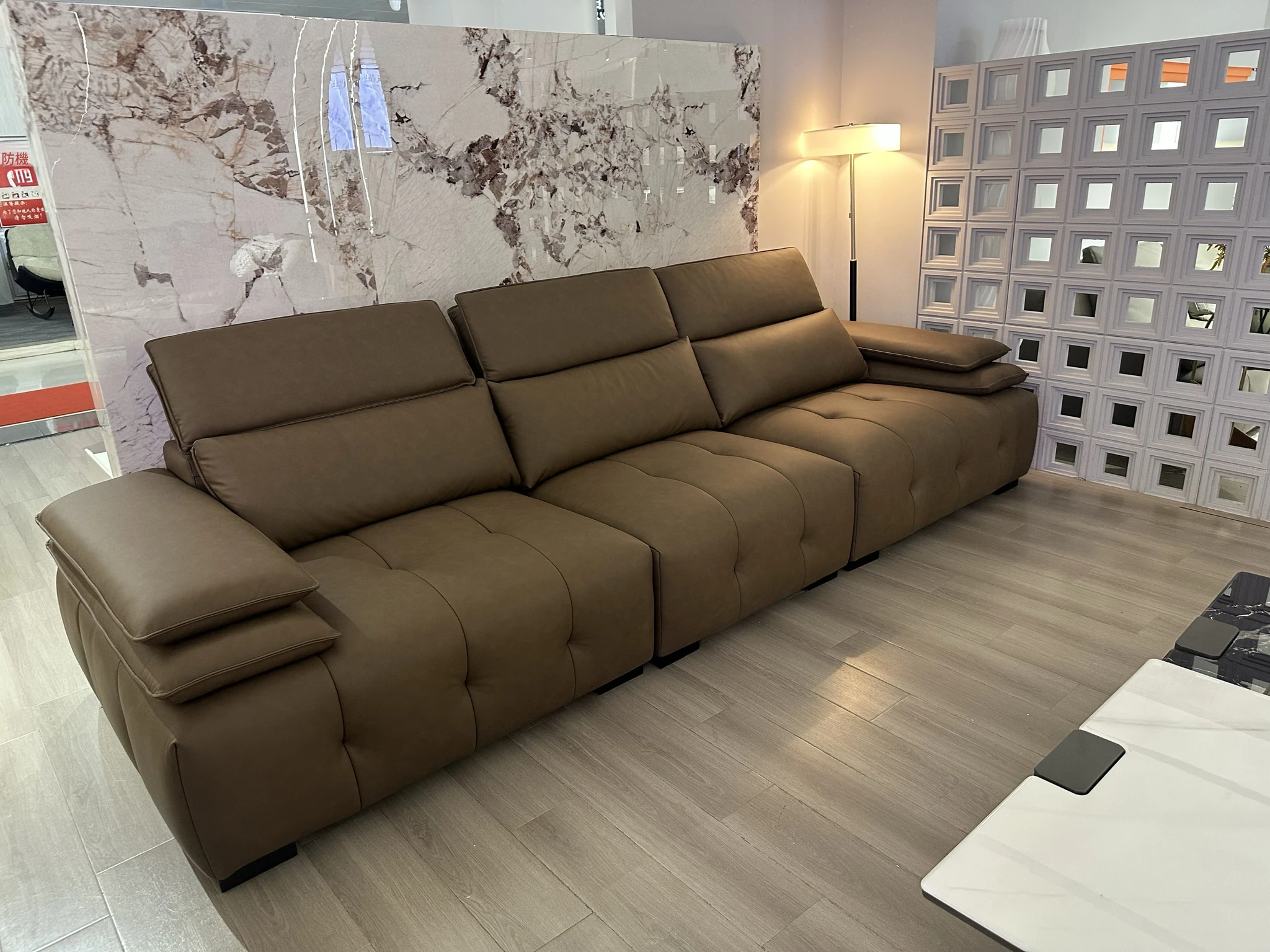 調整可能なヘッドレスト付き3人掛けソファ - 小型リビングにぴったり!ダークブラウンのストレートデザインで、スタイリッシュで快適な空間を演出。あなたのリビングに最適な選択です!