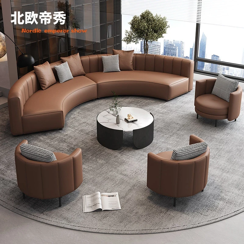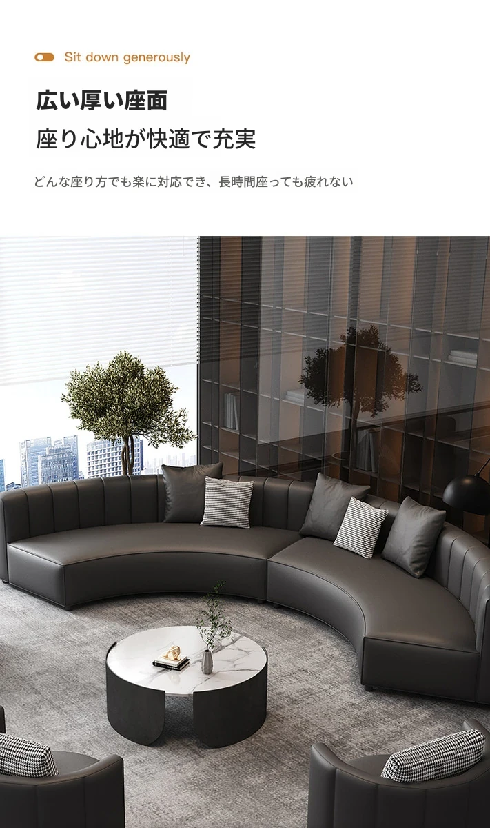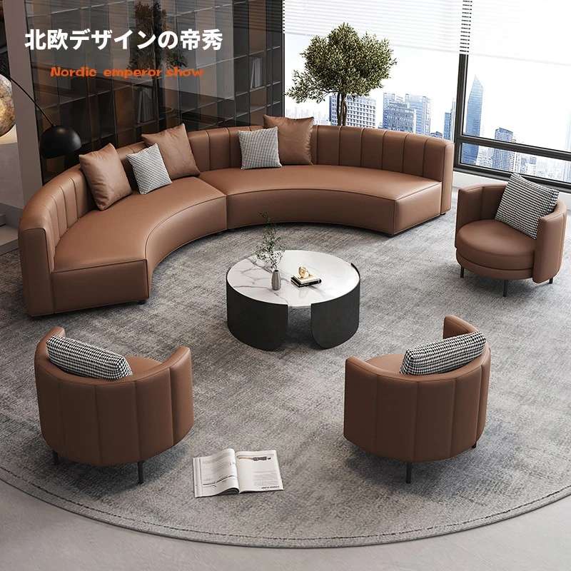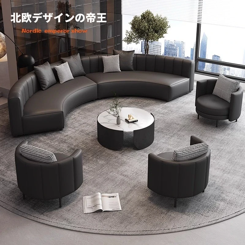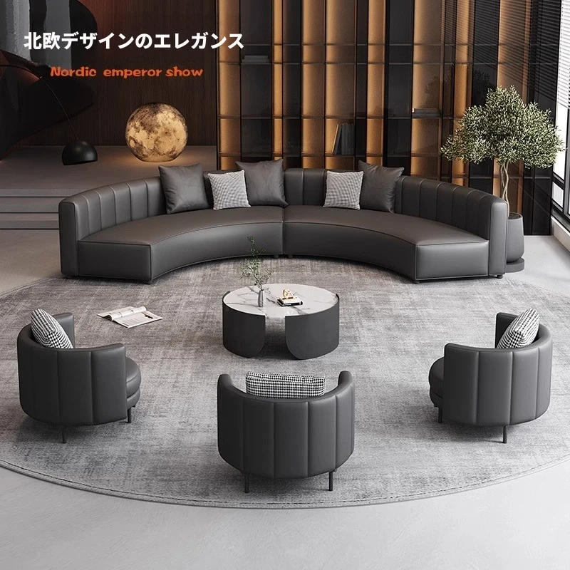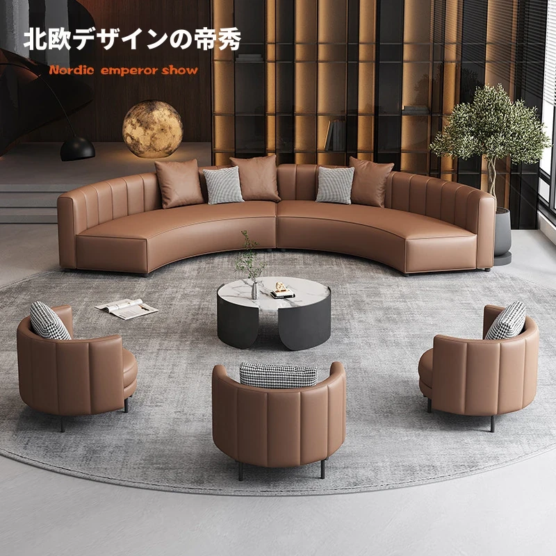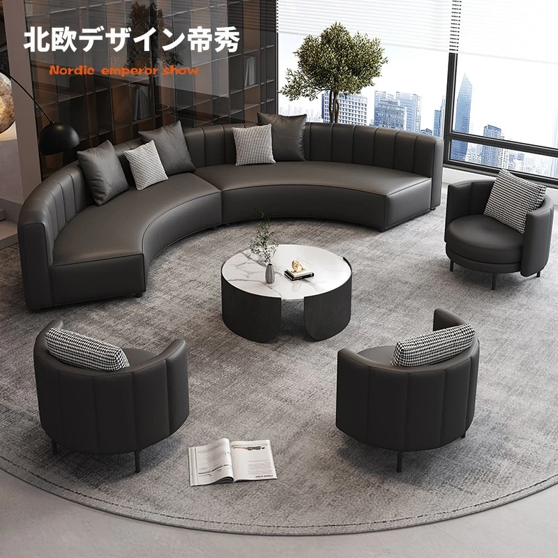 ホテルロビーに最適な曲線デザインのソファセット!ビジネスミーティングや VIP ルームにぴったりのエレガントな接客スペースを演出。洗練された雰囲気で、商談を成功に導く完璧なアイテムです!