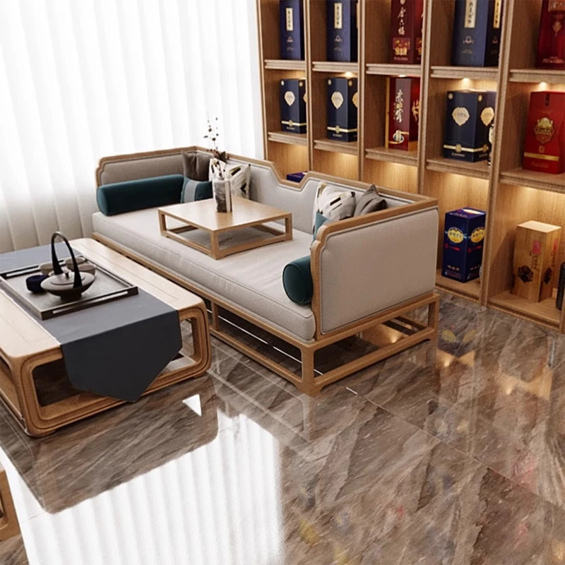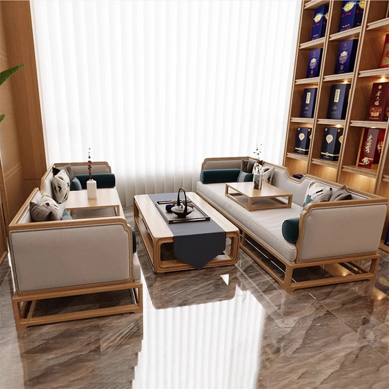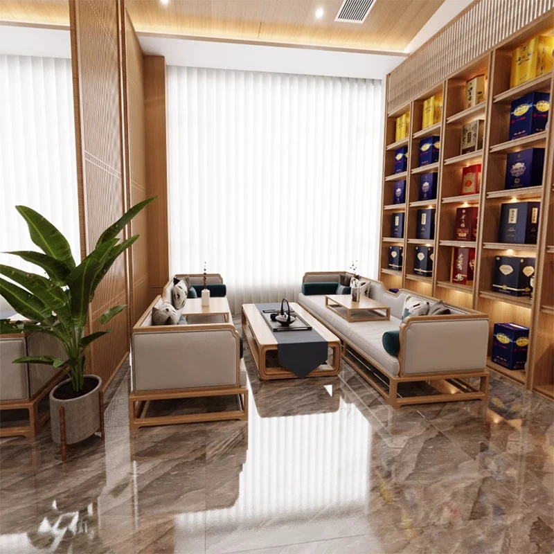 新中式スタイルの無垢材製ソファセット - 民宿・ホテル・クラブのロビーや販売所に最適な接客・会談用カウンター家具。おしゃれで落ち着いた空間を演出し、ゲストに特別なひとときを提供します!