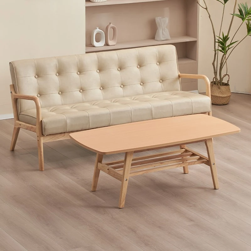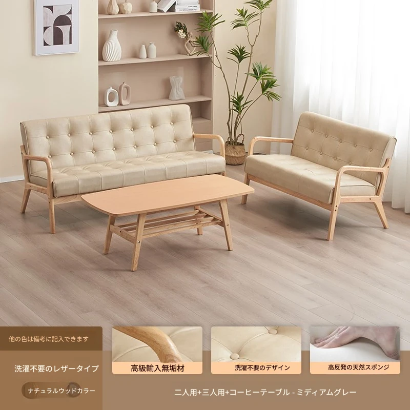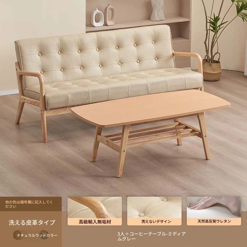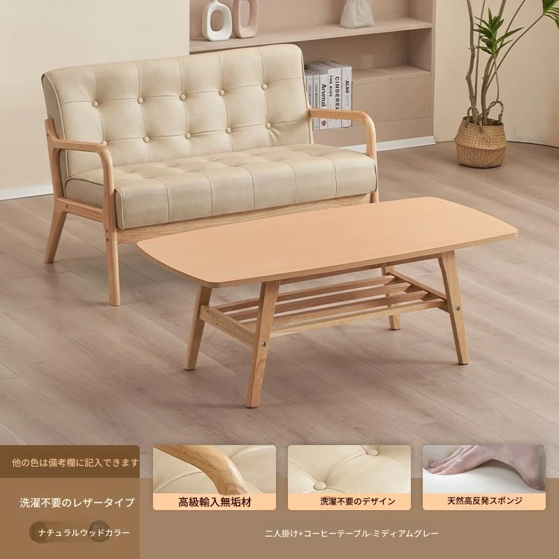 【防水オイルワックスレザー】2シングル1ダブル層コーヒーテーブル-ナチュラルウッドフレーム-ミディアムグレー708