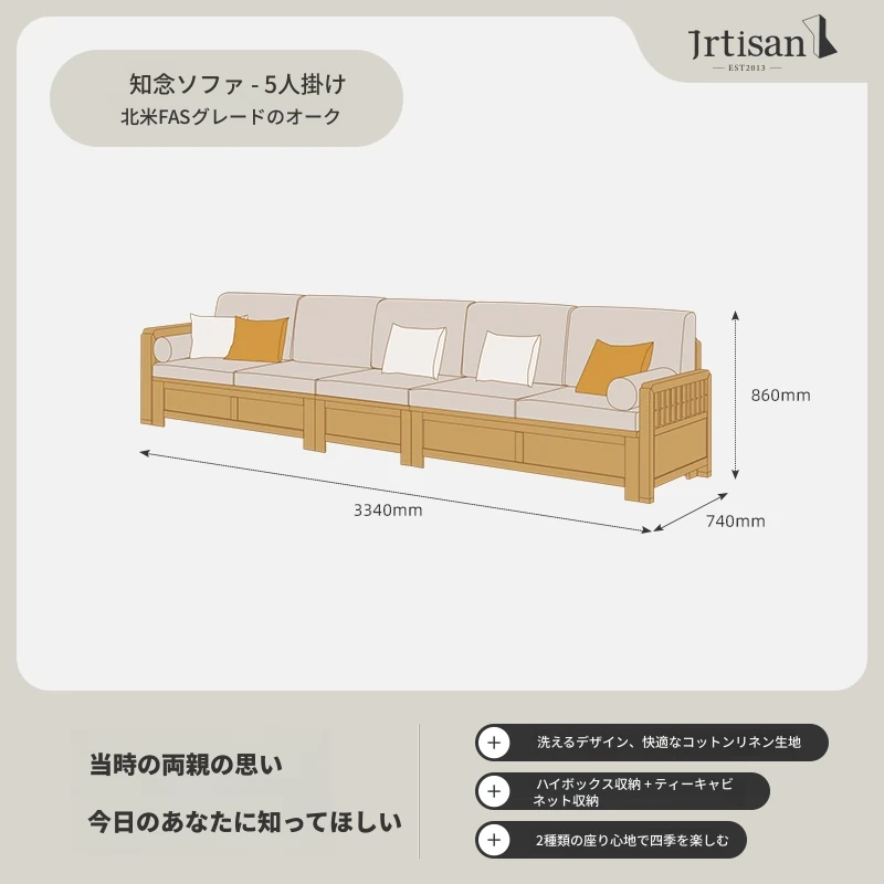 【北米輸入オーク】ストレージファイブソファ(ベージュのコットンリネン)3.34m