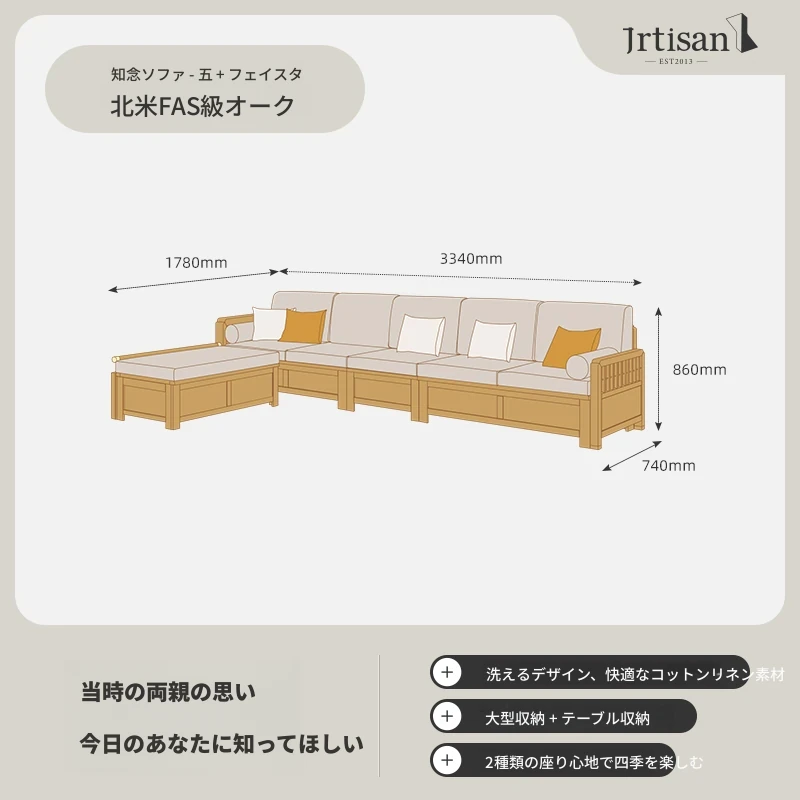 【北米輸入オーク】ストレージファイブソファ+カウチ(ベージュのコットンリネン)3.34m