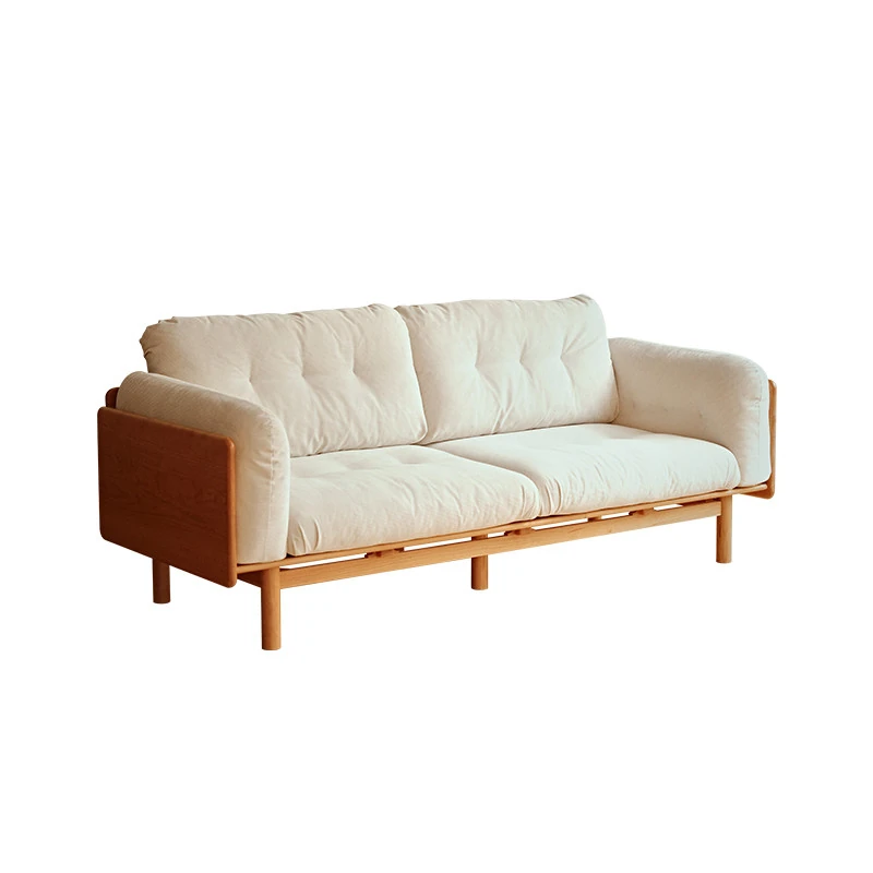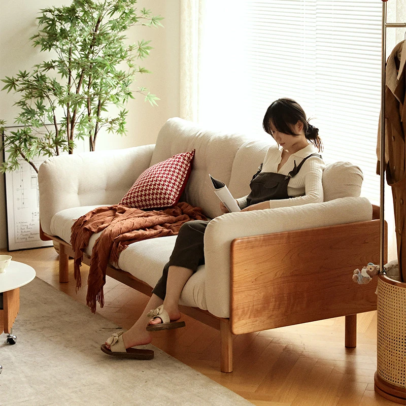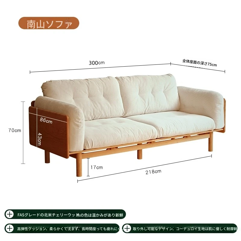 北欧スタイルの無垢材ソファ|シンプルでおしゃれな和風デザイン|小型リビングにぴったり|取り外し可能なライトコーデュロイ生地|快適な3人掛けソファセットで、くつろぎの空間を演出!