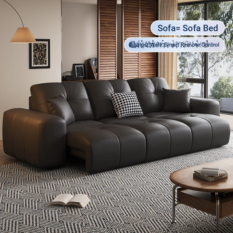 Italian Minimalist Genuine Leather Sofa Bed - Electric, Multi-Functional, Expandable with Remote Control, Black Top-Grain Leather for Home Living Room