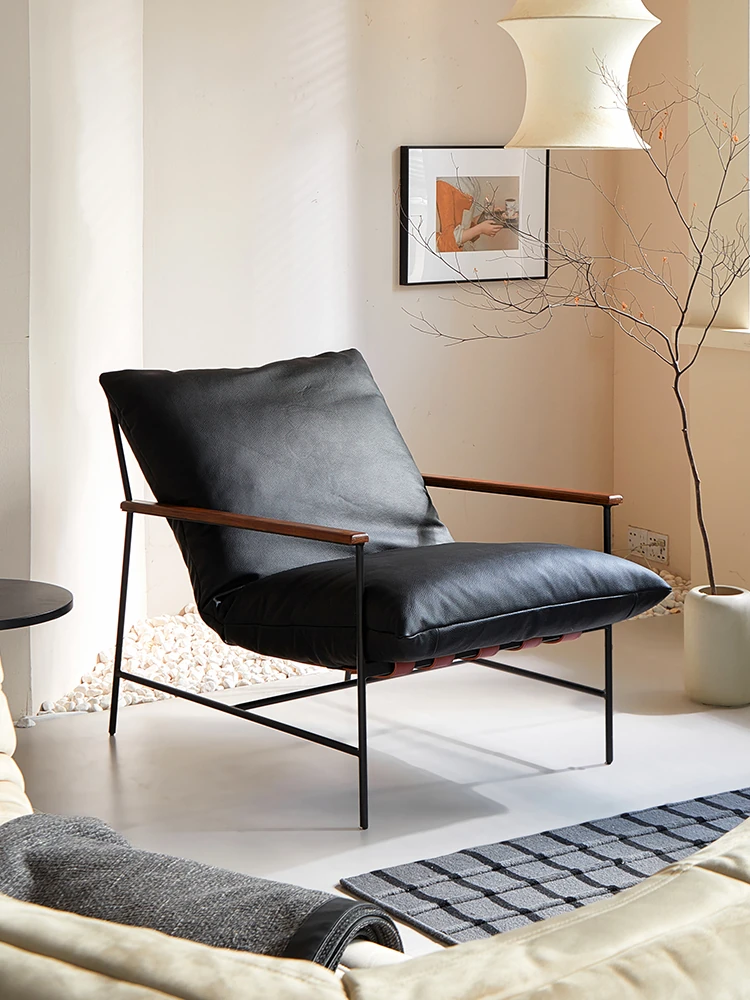 Nordic Designer Leather Armchair - Stylish Single Sofa for Small Spaces, Perfect for Bedroom or Balcony, featuring Elegant Iron Frame and Relaxing Recline Function.