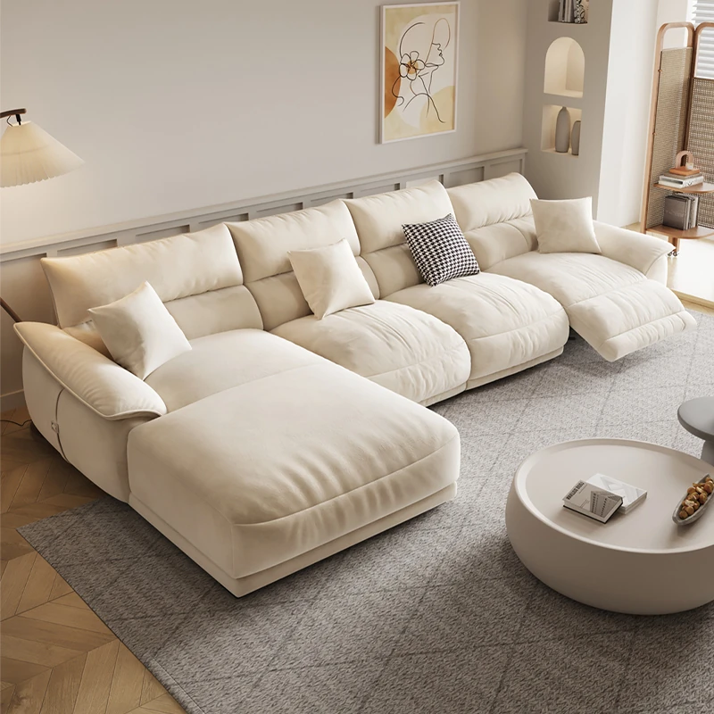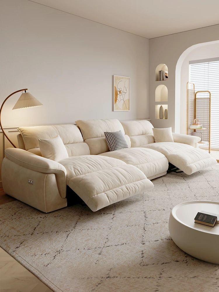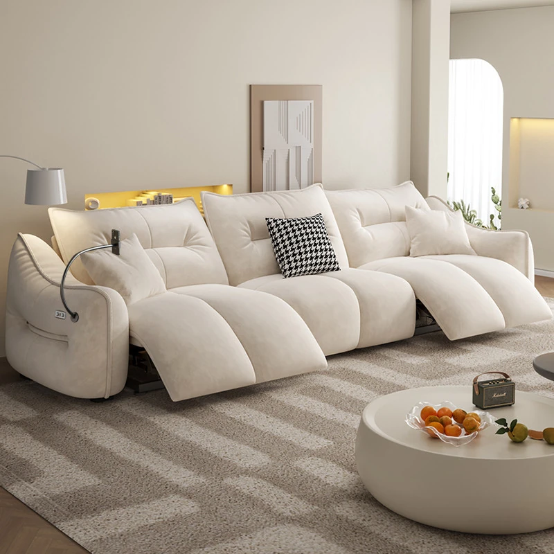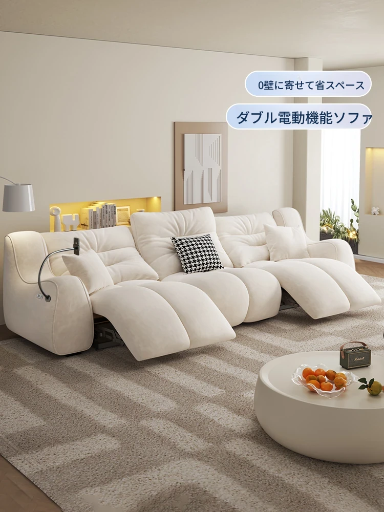 壁を必要としないクリーミーな風合いの電動ソファ - イタリアンラグジュアリーのリビングにぴったり!猫の爪も気にならない高級ファブリック使用、快適な座り心地と多機能を兼ね備えたスペースセーバーソファ。